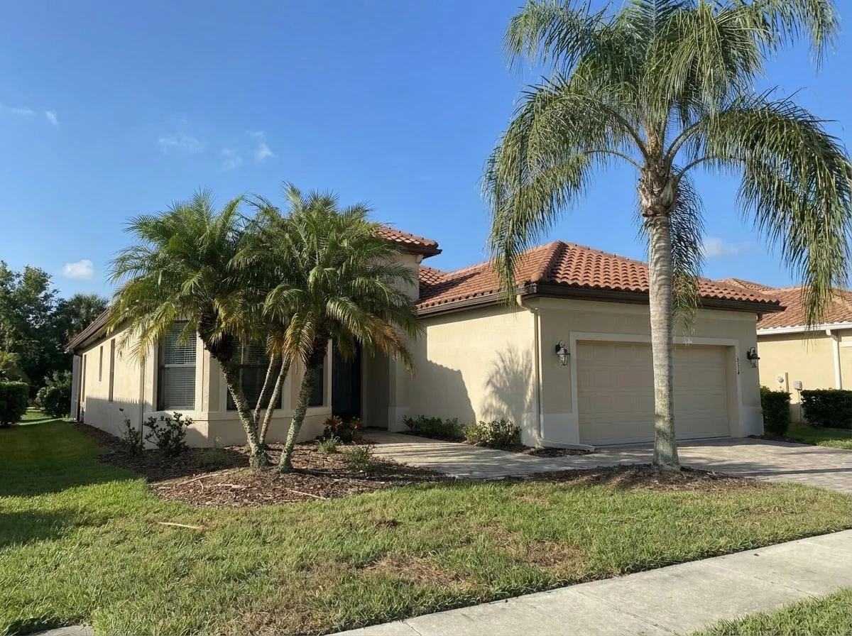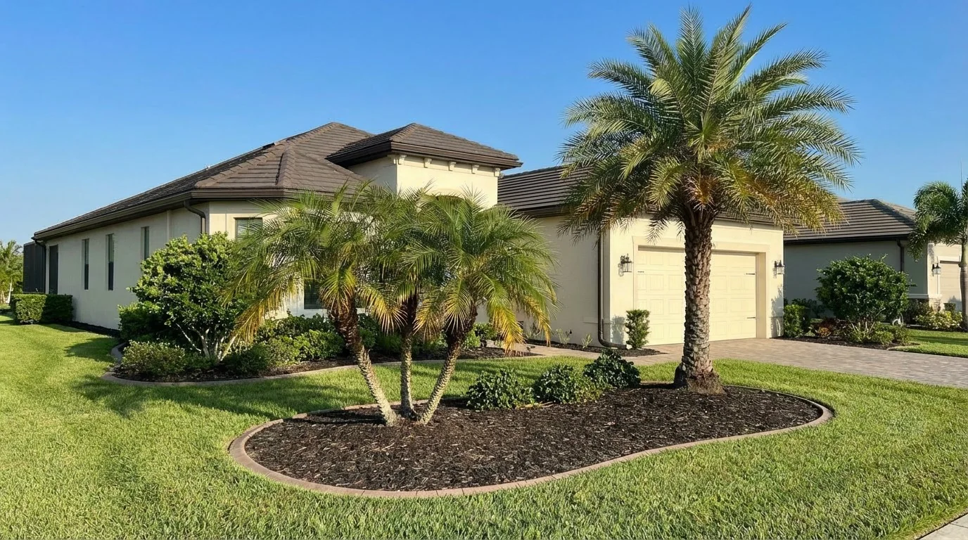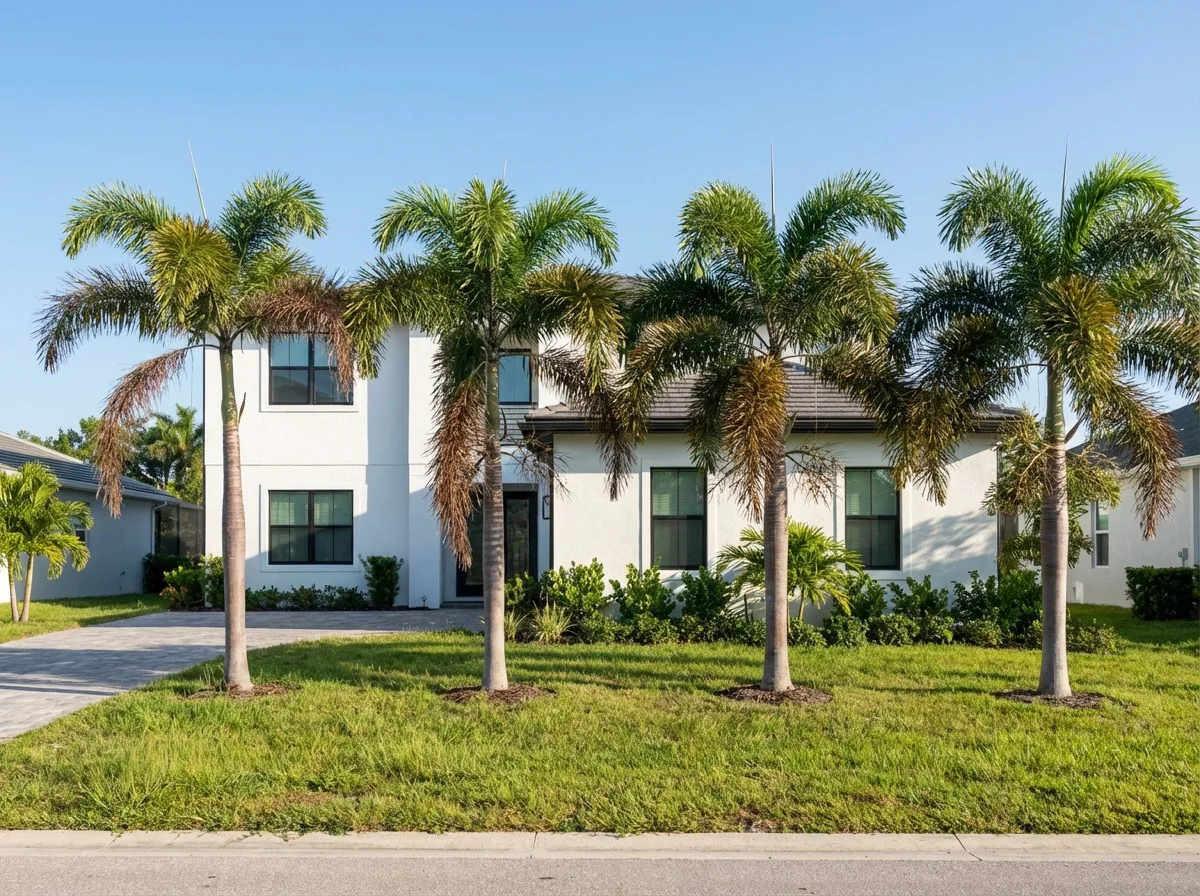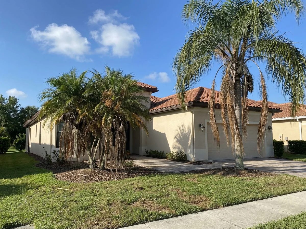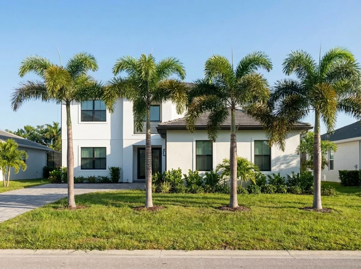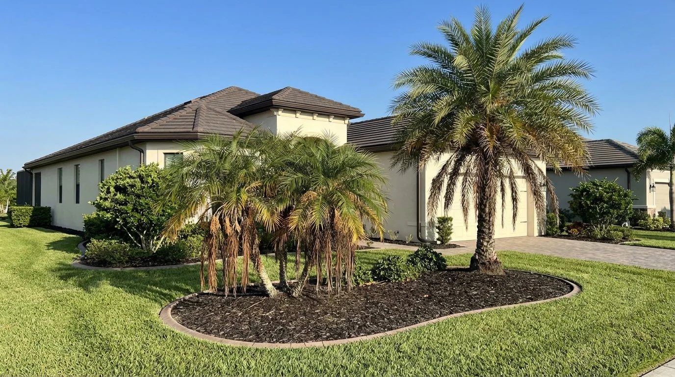 Front entry palms cleaned up to keep the driveway and approach neat, balanced, and well kept.