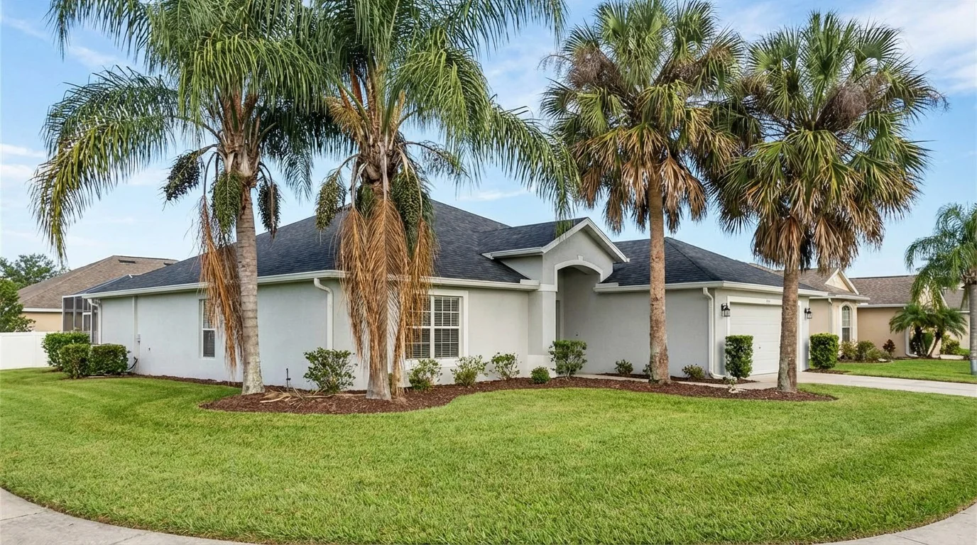Several palm species on a corner lot, all brought back to a clean, balanced look.